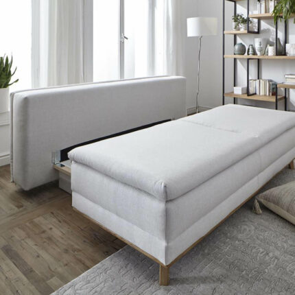Es ist außerdem mühelos in ein vollwertiges Doppelbett mit hochwertiger Kaltschaummatratze ausklappbar. Weiterhin befindet sich unter der Ottomane ein Bettkasten, in dem du bequem alles verstauen kannst, was dein Übernachtungsbesuch benötigt.