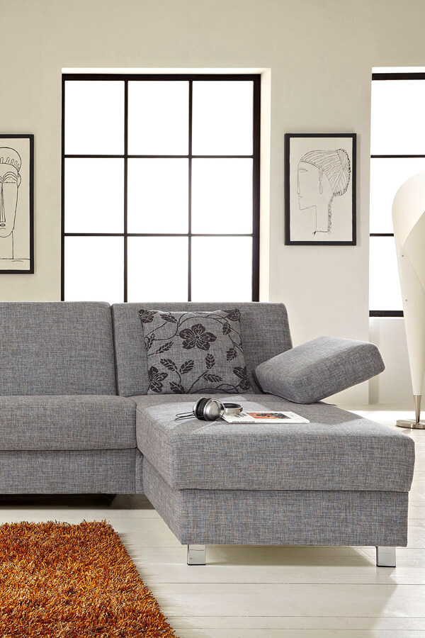 Der anschmiegsame Bezug in Flachgewebe Hellgrau wird auch in Ihrem Wohnraum eine gute Figur machen. Die pflegeleichten Eigenschaften sind dann noch das „i-Tüpfelchen“ und machen das Ecksofa Messina zu einem echten Must-have!
