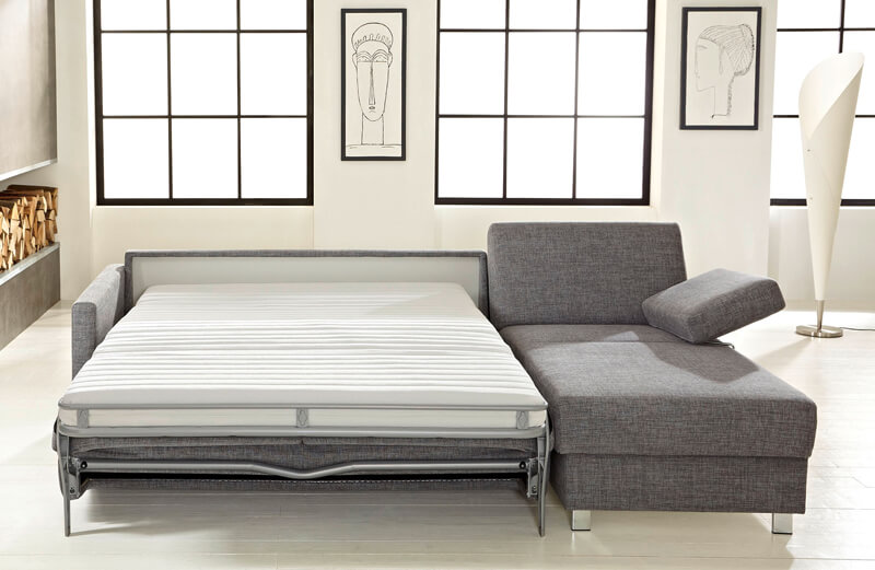 Dank der leichtgängigen Mechanik verwandelt sich das Ecksofa kinderleicht in eine Schlafcouch. Die hochwertige und komfortable Kaltschaummatratze entfaltet sich fast von alleine. Die großzügige Liegefläche von 212×143 cm bietet auch für zwei Übernachtungsgäste ein bequemes Nachtlager mit echtem Bettgefühl.