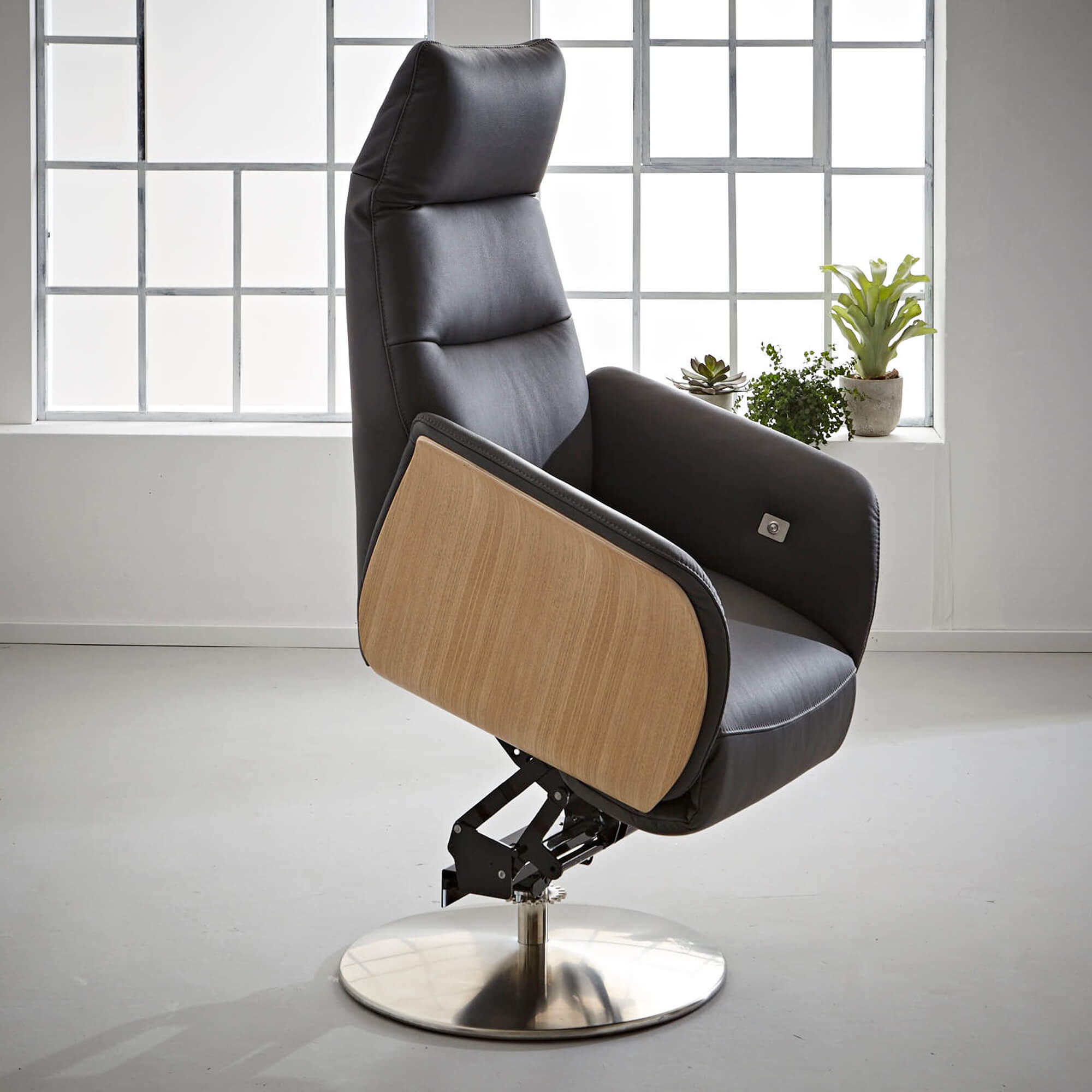Die Armlehne wartet mit einer Holzblende in Eiche-Furnier auf, das gibt Global Trona eine Leichtigkeit, die ihresgleichen sucht.