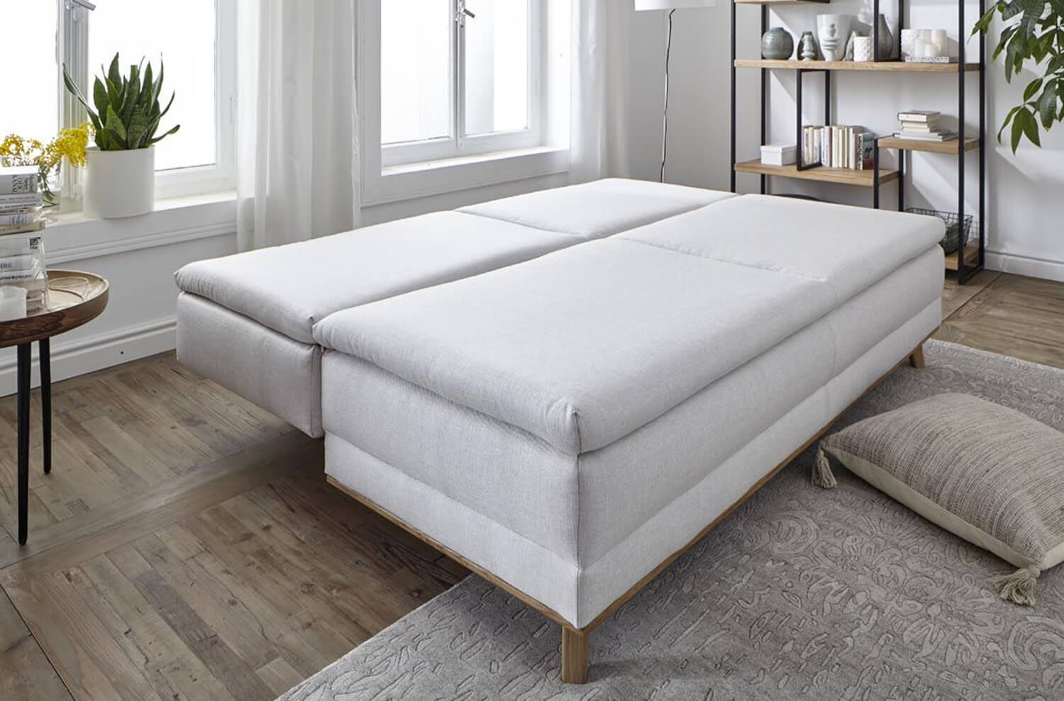 Bei dieser Variante wird vor dem Schlafsofa nicht ganz so viel Platz benötigt – dafür sollte das Sofa eine Sitzbreite von mindestens 200 cm haben, damit auch größere Personen sich auf der Bettcouch bequem ausstrecken können.