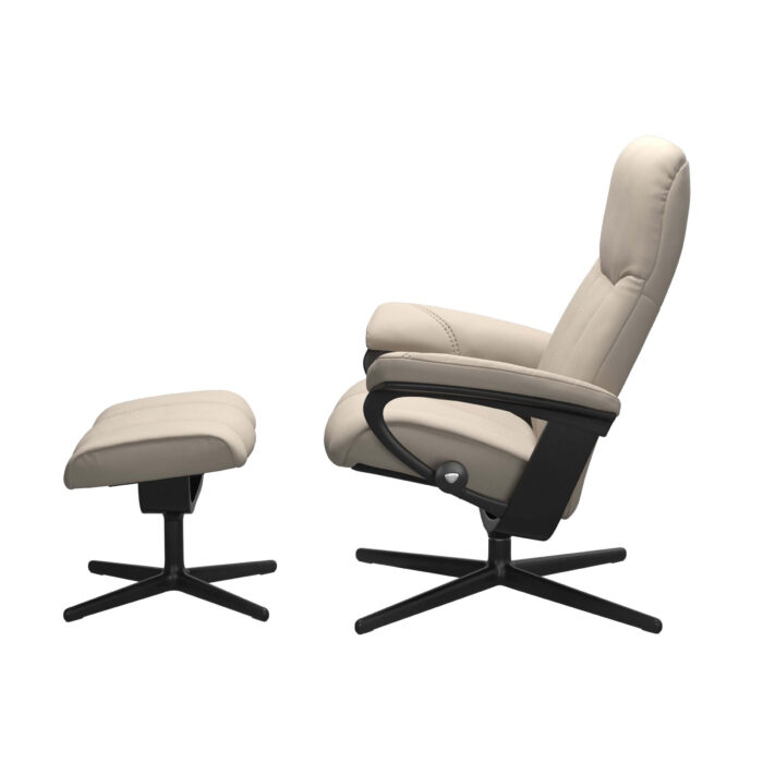 Das Cross Untergestell erhältst du wahlweise in elegantem Aluminium poliert oder modernem matt schwarz. So hast du die Möglichkeit, deinen Stressless Consul Cross optimal an deinen Wohnraum anzupassen.